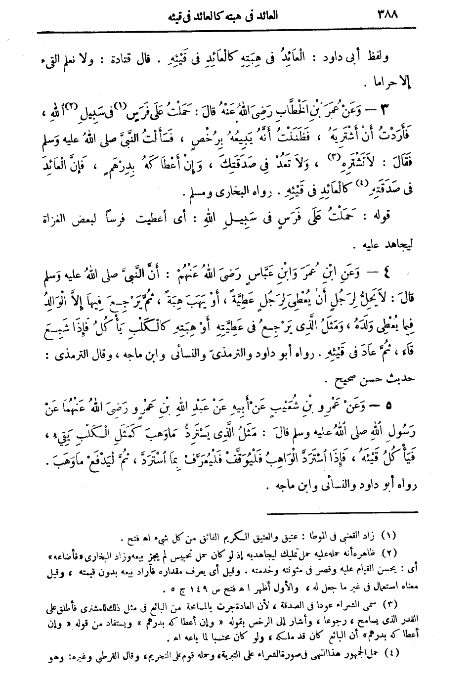5 - وعن عمرو بن شُعيبٍ عن أبيه عن عبد الله بن عمرو رضي الله عنهما عن رسول الله صلى الله عليه وسلم قال: "مثلُ الذي يستردُّ ما وهب كمثل الكلب يقيء، فيأكل قيئهُ، فإذا استرد الواهب فليوقف فَلْيُعَرَّفْ بما اسْتَرَدَّ، ثم لِيَدْفَعَ ما وهب" رواه أبو داود والنسائي وابن ماجة.