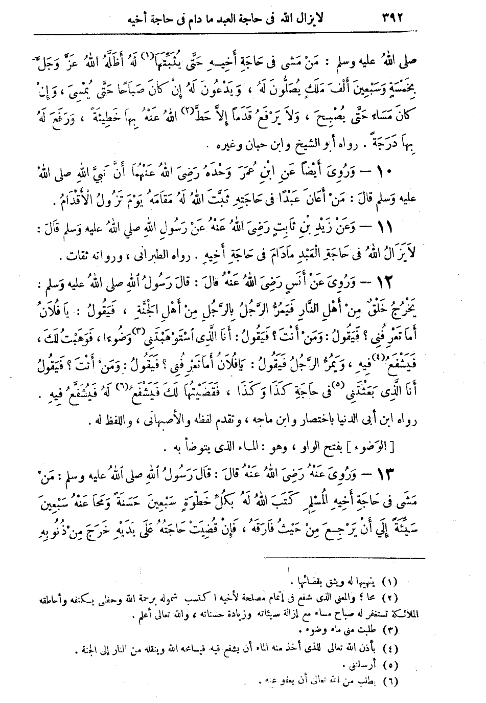 11 - وعن زيد بن ثابتٍ رضي الله عنه عن رسول الله صلى الله عليه وسلم قال: "لا يزالُ الله في حاجةِ العبدِ مادام في حاجة أخيه" رواه الطبراني، ورواته ثقات.