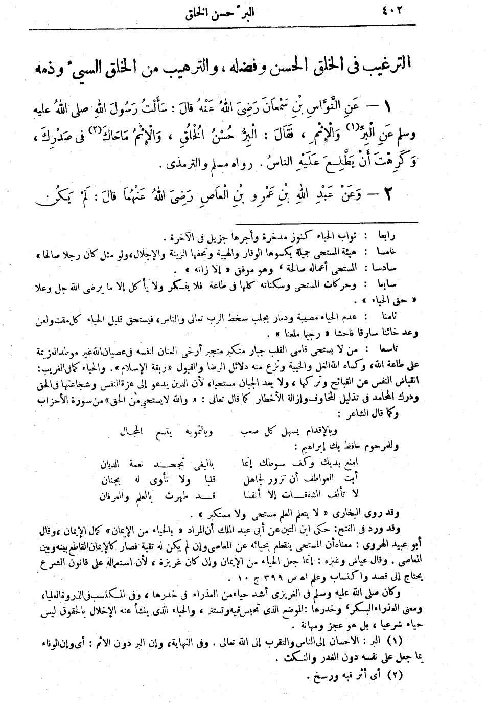 1 - عن النواس بن سمعان رضي الله عنه قال: "سألت رسول الله صلى الله عليه وسلم عن البر (¬1) والإثم، فقال: البر حُسْنُ الْخُلُقِ، والإثمُ ما حَاكَ (¬2) في صَدركَ، وكَرِهْتَ أن يَطلعَ عليه الناسُ" رواه مسلم والترمذي.