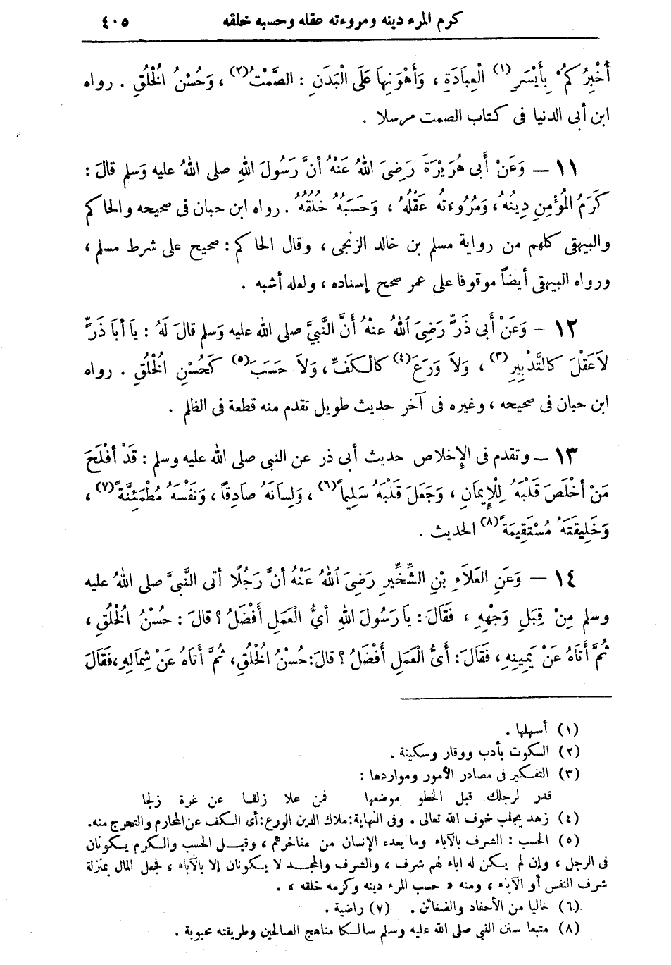 14 - وعن العلاء بن الشِّخِّيرِ رضي الله عنه: "أن رجلاً أتى النبي صلى الله عليه وسلم من قِبَلِ وَجْهِهِ، فقال يا رسول الله: أي العمل أفضلُ؟ قال: حُسْنُ الخلق، ثم أتاهُ عن يمينه، فقال: أي العمل أفضلُ؟ قال: حُسْنُ الخلق، ثم أتاهُ عن شمالهِ، فقال