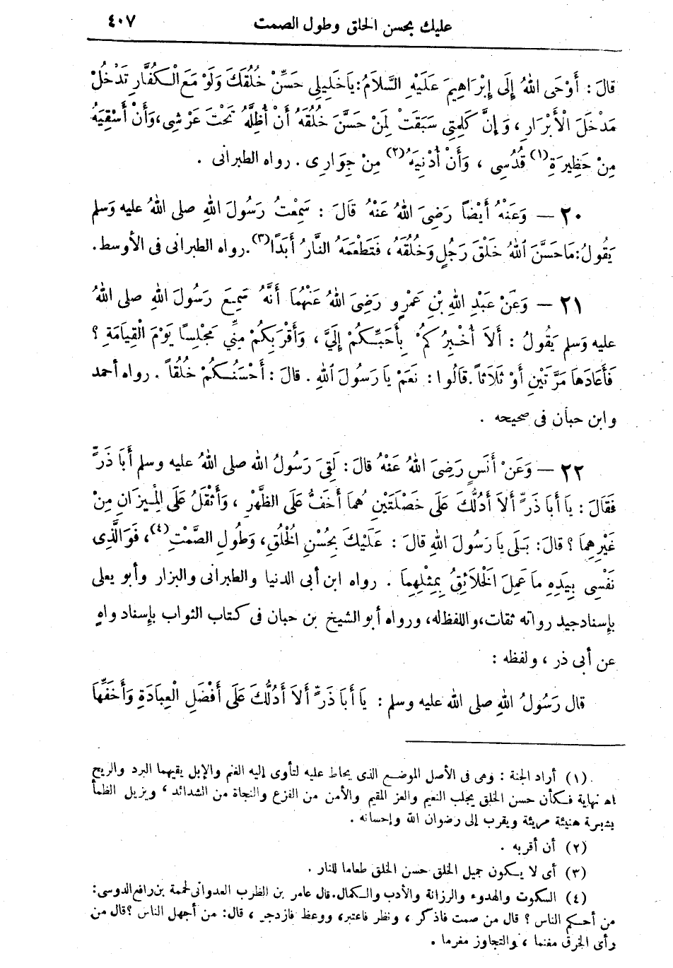 22 - وعن أنسٍ رضي الله عنه قال: "لقيَ رسول الله صلى الله عليه وسلم أبا ذر فقال: يا أبا ذرٍ ألا أدُلُّكَ على خَصْلَتيْنِ هما أخفُّ على الظهر، وأثقلُ على الميزانِ من غيرهما؟ قال: بلى يا رسول الله قال: عليك بِحُسْنِ الخُلُقِ، وطُولِ الصَّمْتِ (¬4)، فوالذي نفسي بيده ما عمل الخلائقُ بمثلهما" رواه ابن أبي الدنيا والطبراني والبزار وأبو يعلى بإسناد جيد ورواته ثقات، واللفظ له، ورواه أبو الشيخ ابن حبان في كتاب الثواب بإسناد واهٍ عن أبي ذر، ولفظه: "قال رسول الله صلى الله عليه وسلم: يا أبا ذرٍ ألا أدلك على أفضل العبادة، وأخفها