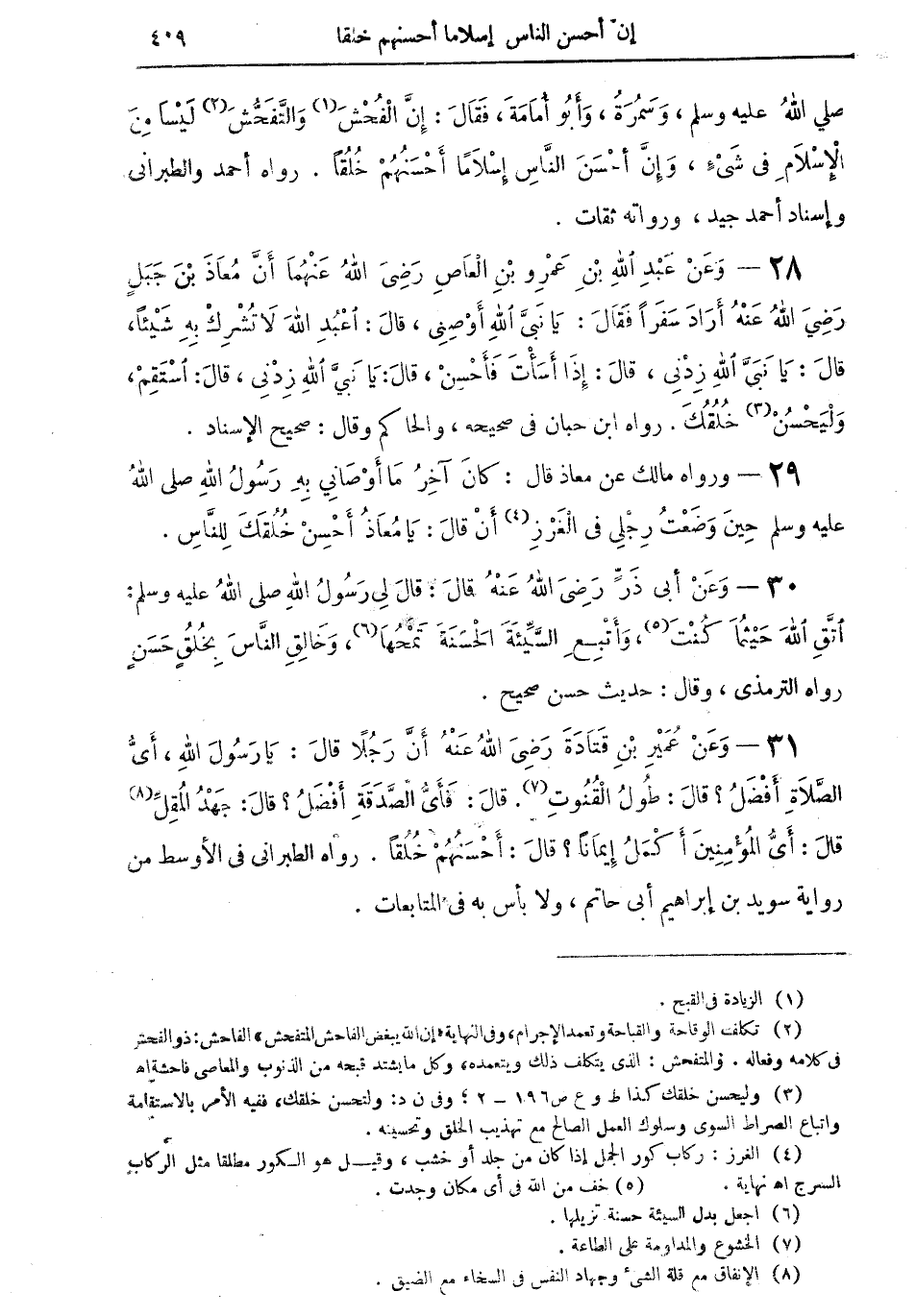 ليسا من الإسلام في شيء، وإن أحسن الناس إسلاماً أحسنهم خُلُقاً" رواه أحمد والطبراني وإسناد أحمد جيد، ورواته ثقات.