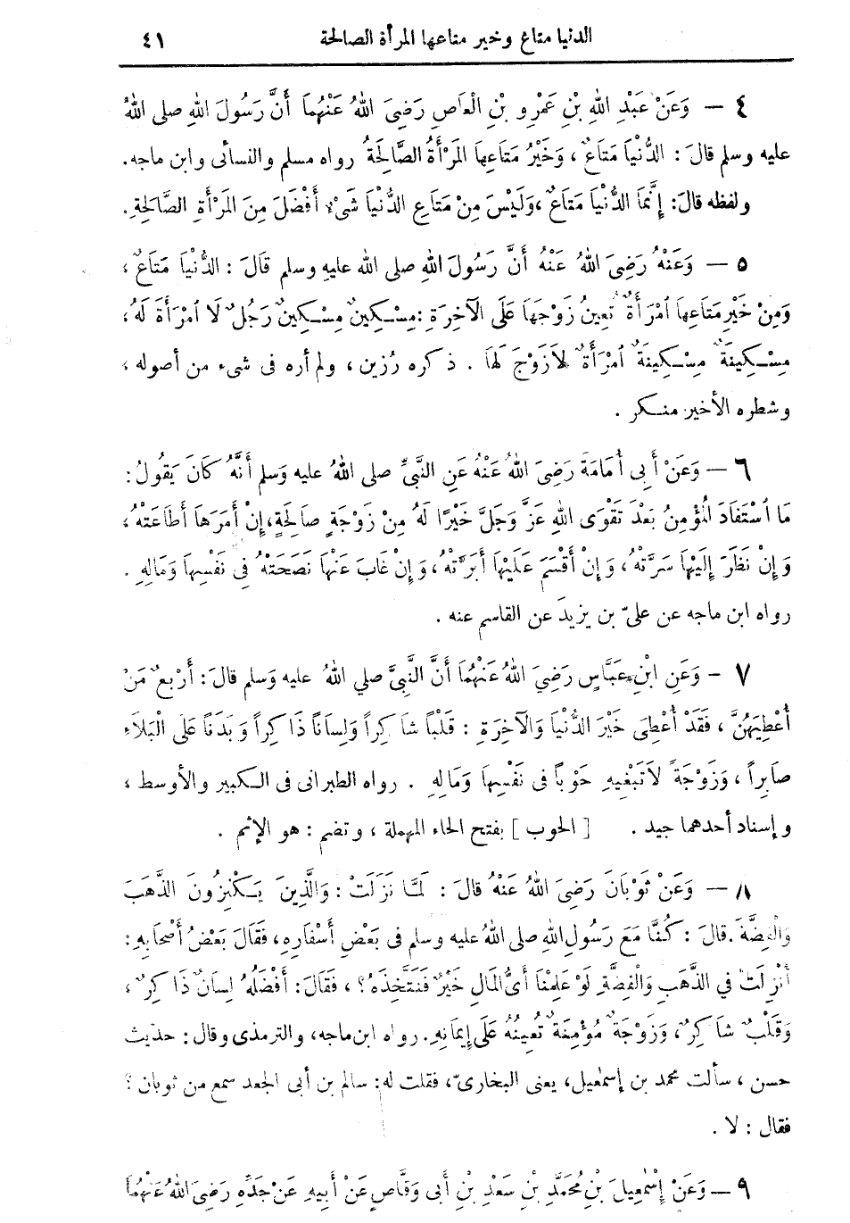 4 - وعن عبد الله بن عمرو بن العاص رضي الله عنهما أن رسول الله صلى الله عليه وسلم قال: "الدنيا متاعٌ، وخير متاعها المرأة الصالحة" رواه مسلم والنسائي وابن ماجة، ولفظه قال: إنما الدنيا متاعٌ، وليس من متاع الدنيا شيئ أفضل من المرأة الصالحة.