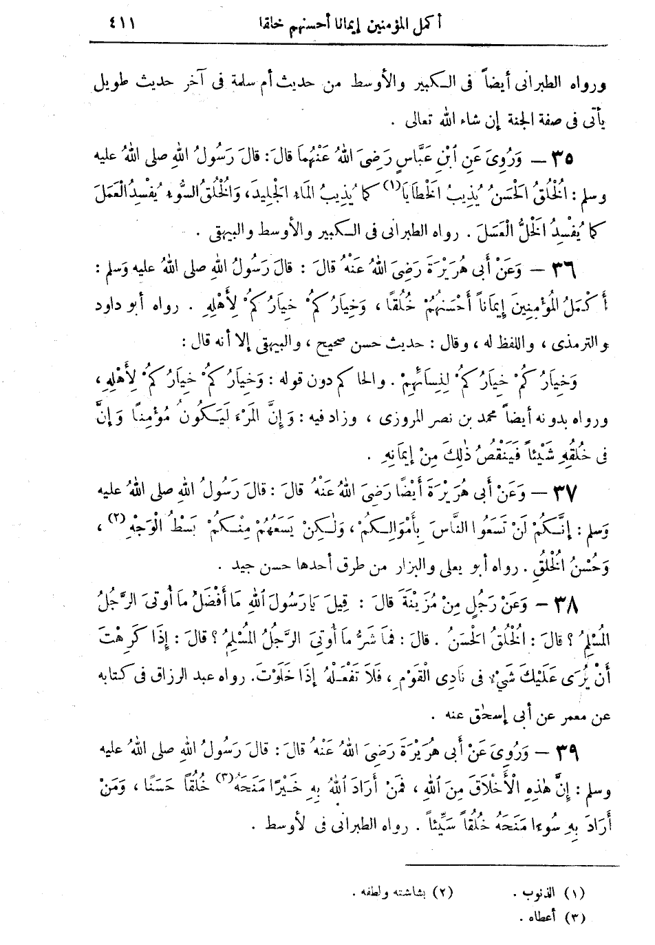 35 - ورويَ عن ابن عباس رضي الله عنهما قال: قال رسول الله صلى الله عليه وسلم: "الْخُلُقُ الْحَسَنُ يُذِيبُ الخطايا (¬1) كما يُذيبُ الماء الجليد، والخلقُ السوء يفسد العمل كما يفسد الخلُّ العسل" رواه الطبراني في الكبير والأوسط والبيهقي.