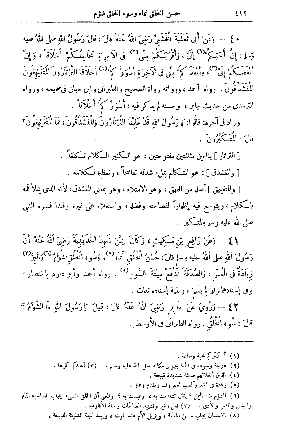 40 - وعن أبي ثعلبة الْخُشَنِيِّ رضي الله عنه قال: قال رسول الله صلى الله عليه وسلم: "إن أحَبَّكُمْ (¬1) إليَّ، وأقربكم مني (¬2) في الآخرة محاسنكم أخلاقاً، وإن أبغضكم إليَّ (¬3)، وأبعدكم مني في الآخرة أسوؤكم (¬4) أخلاقاً الثرثارون المتفيهقون المتشدقون" رواه أحمد، ورواته رواة الصحيح والطبراني وابن حبان في صحيحه، ورواه الترمذي من حديث جابر، وحسنه لم يذكر فيه: أسوؤكم أخلاقاً. وزاد في آخره: قالوا: يا رسول الله قد علمنا الثرثارون والمتشدقون، فما المتفيهقون؟ قال: المتكبرون.