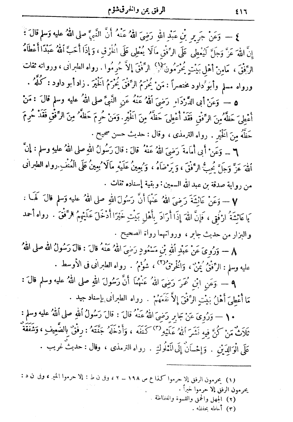 9 - وعن ابن عمر رضي الله عنهما أن رسول الله صلى الله عليه وسلم قال: "ما أُعطيَ أهلُ بيتٍ الرفق إلا نفعهم" رواه الطبراني بإسناد جيد.