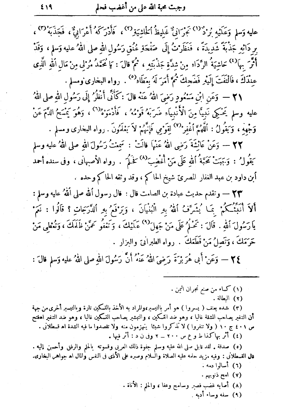22 - وعن عائشة رضي الله عنها قالت: سمعت رسول الله صلى الله عليه وسلم يقول: "وَجَبَتْ محبةُ الله على من أُغْضِبَ (¬8) فَحَلُمَ" رواه الأصبهاني، وفي سنده أحمد بن داود بن عبد الغفار المصري شيخ الحاكم، وقد وثقه الحاكم وحده.