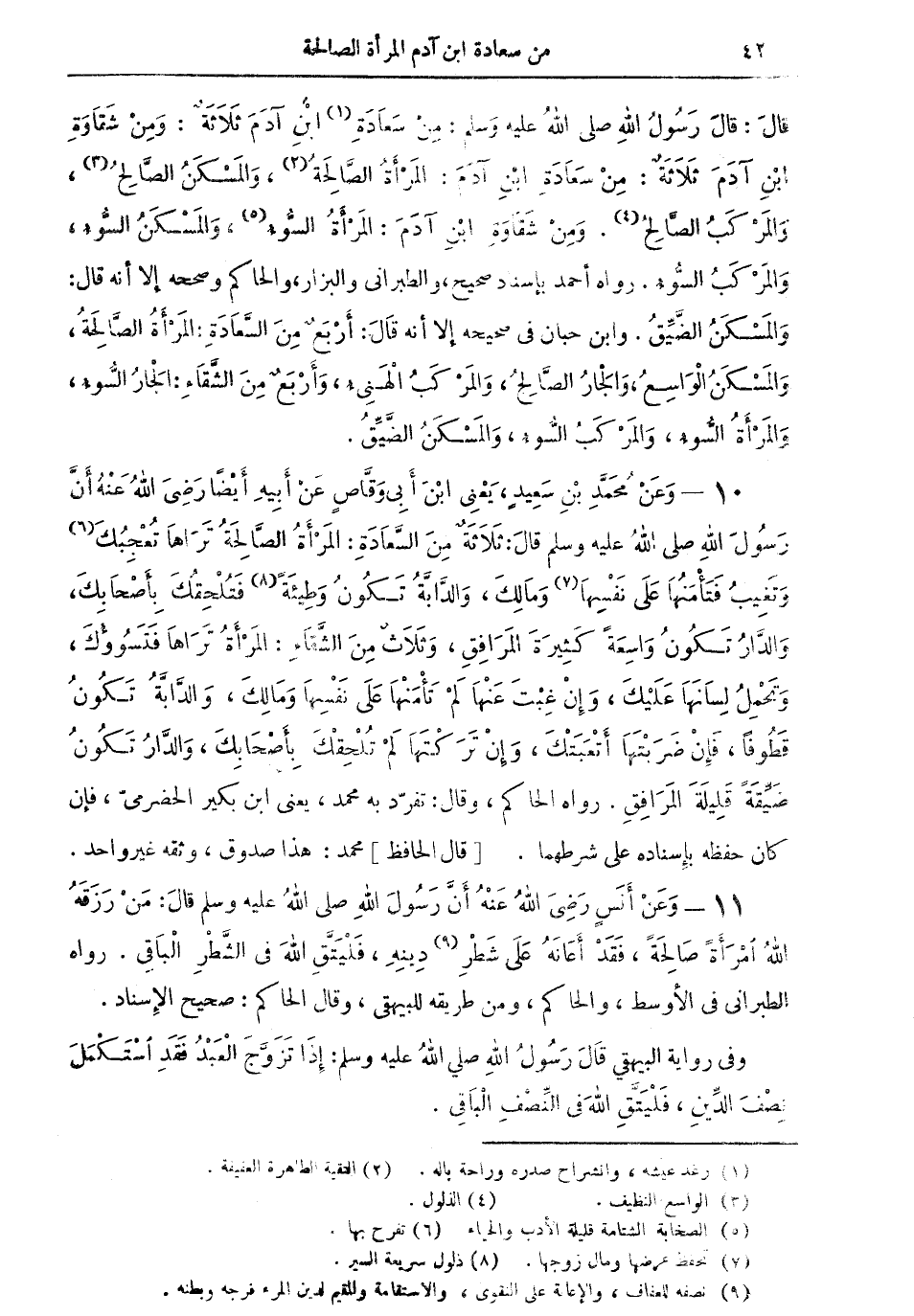 قال: قال رسول الله صلى الله عليه وسلم: "مِنْ سعادة (¬1) ابن آدم ثلاثةٌ: وَمِنْ شقاوةِ ابن آدم ثلاثةٌ: مِنْ سعادة ابن آدم: المرأة الصالحة (¬2)، والمسكن الصالح (¬3)، والمركب الصالحُ (¬4). ومن شقاوة ابن آدم: المرأة السوء (¬5)، والمسكن السوء، والمركب السوء" رواه أحمد بإسناد صحيح، والطبراني والبزار، والحاكم وصححه إلا أنه قال: والمسكن الضيق، وابن حبان في صحيحه إلا أنه قال: أربعٌ من السعادة: المرأة الصالحة، والمسكن الواسع، والجارُ الصالح، والمركب الهنئ، وأربعٌ من الشقاء: الجار السوء، والمرأة السوء، والمركب السوء، والمسكن الضيق.