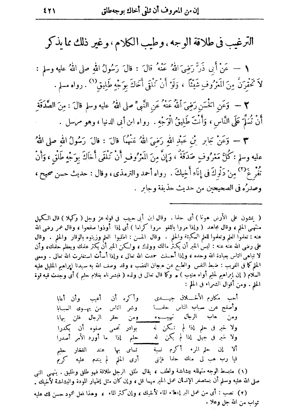 (¬1) منبسط الوجه متهلله ببشاشة ولطف، يقال طلق الرجل طلاقة فهو طلق وطليق. ينهى النبي صلى الله عليه وسلم أن يستصغر الإنسان عمل الخير مهما قل، وإن كان مثل إظهار المودة والبشاشة لأخيك.