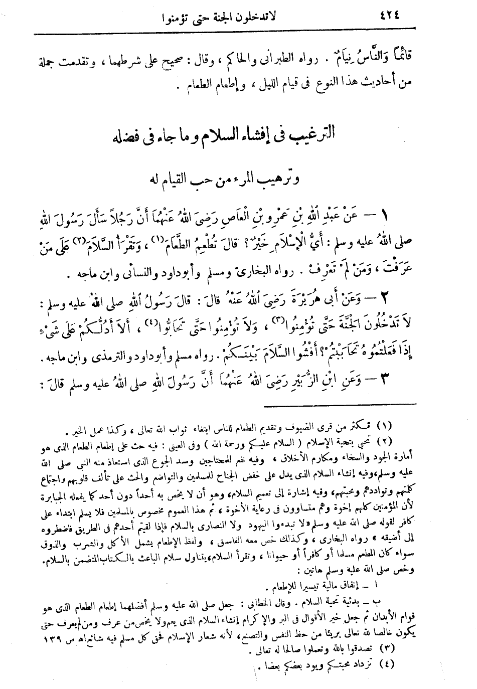 1 - عن عبد الله بن عمرو بن العاص رضي الله عنهما: "أن رجلاً سأل رسول الله صلى الله عليه وسلم: أيُّ الإسلام خيرٌ؟ قال تُطعم الطعام (¬1)، وتقرأ السلام (¬2) على من عرفت، ومن لم تعرف" رواه البخاري ومسلم وأبو داود والنسائي وابن ماجة.