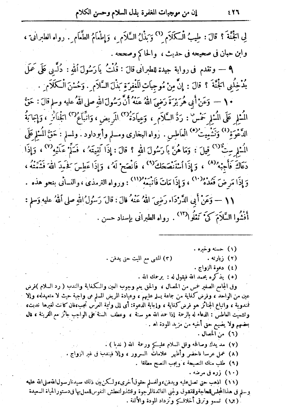 9 - وتقدم في رواية جيدة للطبراني قال: "قُلتُ يا رسول الله: دُلَّني على عمل يُدخلُني الجنة؟ قال: إن من موجبات المغفرة بذل السلام وحُسنَ الكلام".