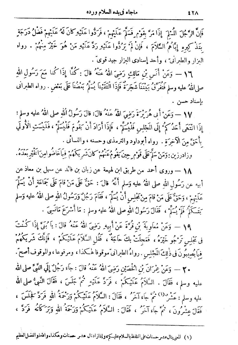 16 - وعن أنس بن مالك رضي الله عنه قال: "كنا مع رسول الله صلى الله عليه وسلم فَتُفَرِّقُ بيننا شجرةٌ فإذا التقينا يُسَلِّمُ بعضنا على بعضٍ" رواه الطبراني بإسناد حسن.