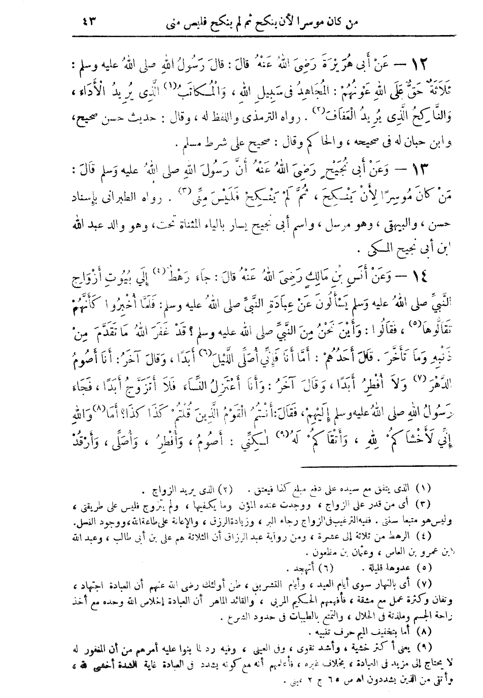 13 - وعن أبي نُجَيْحٍ رضي الله عنه أن رسول الله صلى الله عليه وسلم قال: "من كان موسراً لأن ينكح، ثم لم ينكح فليس مني (¬3) " رواه الطبراني بإسناد حسن، والبيهقي، وهو مرسل، واسم أبي نجيح يسار بالياء المثناة تحت، وهو والد عبد الله بن أبي نجيح المكي.