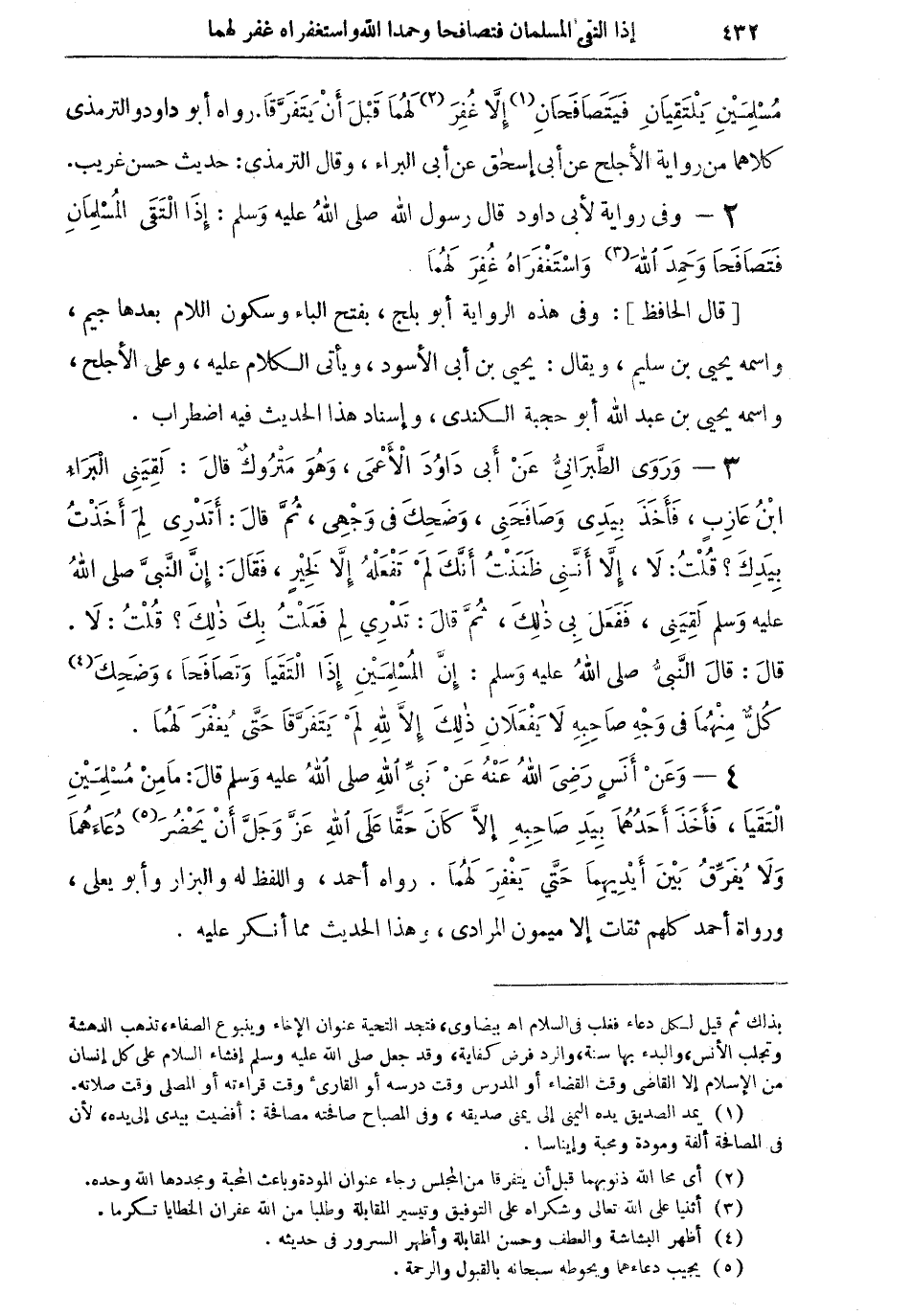 مُسْلِمَيْنِ يلتقيانِ فيتصافحان (¬1) إلا غُفِرَ (¬2) لهما قبل أن يتفرقا" رواه أبو داود والترمذي كلاهما من رواية الأجلح عن أبي إسحاق عن أبي البراء، وقال الترمذي: حديث حسن غريب.