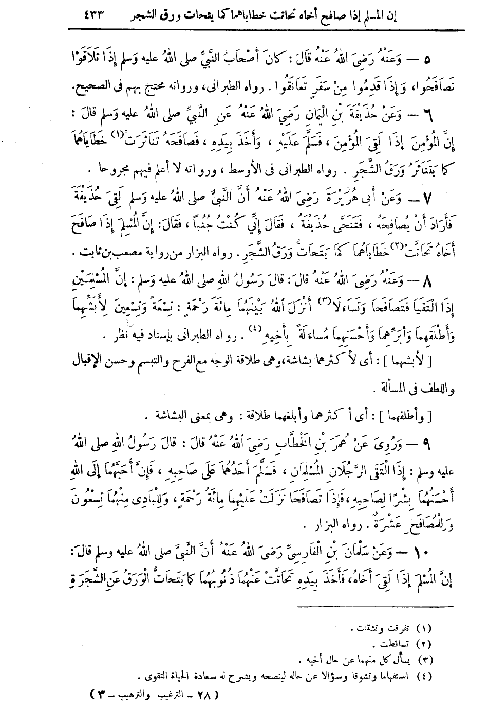 10 - وعن سلمان بن الفارسيِّ رضي الله عنه: أن النبي صلى الله عليه وسلم قال: "إن المسلمَ إذا لقيَ أخاهُ، فأخذ بيده تحاتَّتْ عنهما ذنوبهما كما يتحاتُّ الورقُ عن الشجرةِ