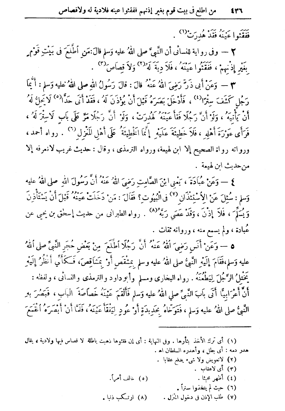 5 - وعن أنسٍ رضي الله عنه: "أن رجلاً اطلع من بعض حُجَرِ النبي صلى الله عليه وسلم، فقام إليه النبيُّ صلى الله عليه وسلم بِمِشقَصٍ أو بِمَشَاقِصَ، فكأني أنْظُرُ إليه يختلُ الرجلَ ليطعنهُ" رواه البخاري ومسلم وأبو داود والترمذي والنسائي، ولفظه: "أن أعرابياً أتى باب النبي صلى الله عليه وسلم فألقَمَ عَيْنَهُ خصاصةَ البابِ، فبَصُرَ بهِ النبي صلى الله عليه وسلم، فَتَوَخَّاهُ بحديدةٍ أو عُودٍ ليفقأ عَيْنَهُ، فلما أن أبصرهُ انقمعَ،