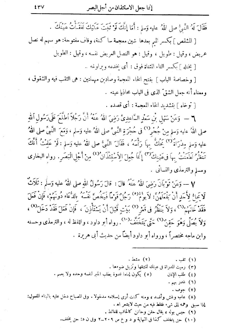 في حُجْرَةِ النبي صلى الله عليه وسلم، ومع النبي صلى الله عليه وسلم مِدْرَاةٌ (¬2) يَحُكُّ بها رأسهُ، فقال النبي صلى الله عليه وسلم: لو علمتُ أنك تنظرُ لطعنتُ بها في عينكَ (¬3) إنما جُعِلَ الاستئذانُ (¬4) من أجل البَصَرِ" رواه البخاري ومسلم والترمذي والنسائي.