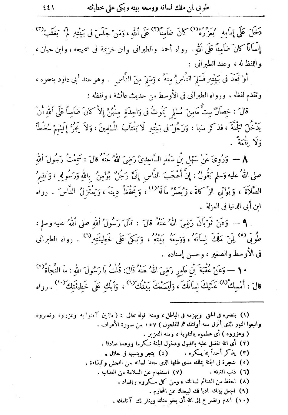 9 - وعن ثوبان رضي الله عنه قال: قال رسول الله صلى الله عليه وسلم: "طُوبى (¬5) لمن مَلَكَ لسانهُ، وَوَسِعَهُ بَيْته، وبكى على خطيئته (¬6) " رواه الطبراني في الأوسط والصغير، وحسن إسناده.