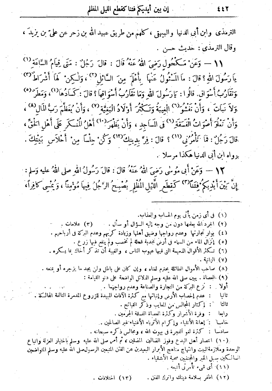 12 - وعن أبي موسى رضي الله عنه قال: قال رسول الله صلى الله عليه وسلم: "إن بين أيديكم فتناً (¬13) كَقِطَعِ الليلِ المُظْلِمِ يُصْبِحُ الرجلُ فيها مؤمناً، ويُمسي كافراً،
