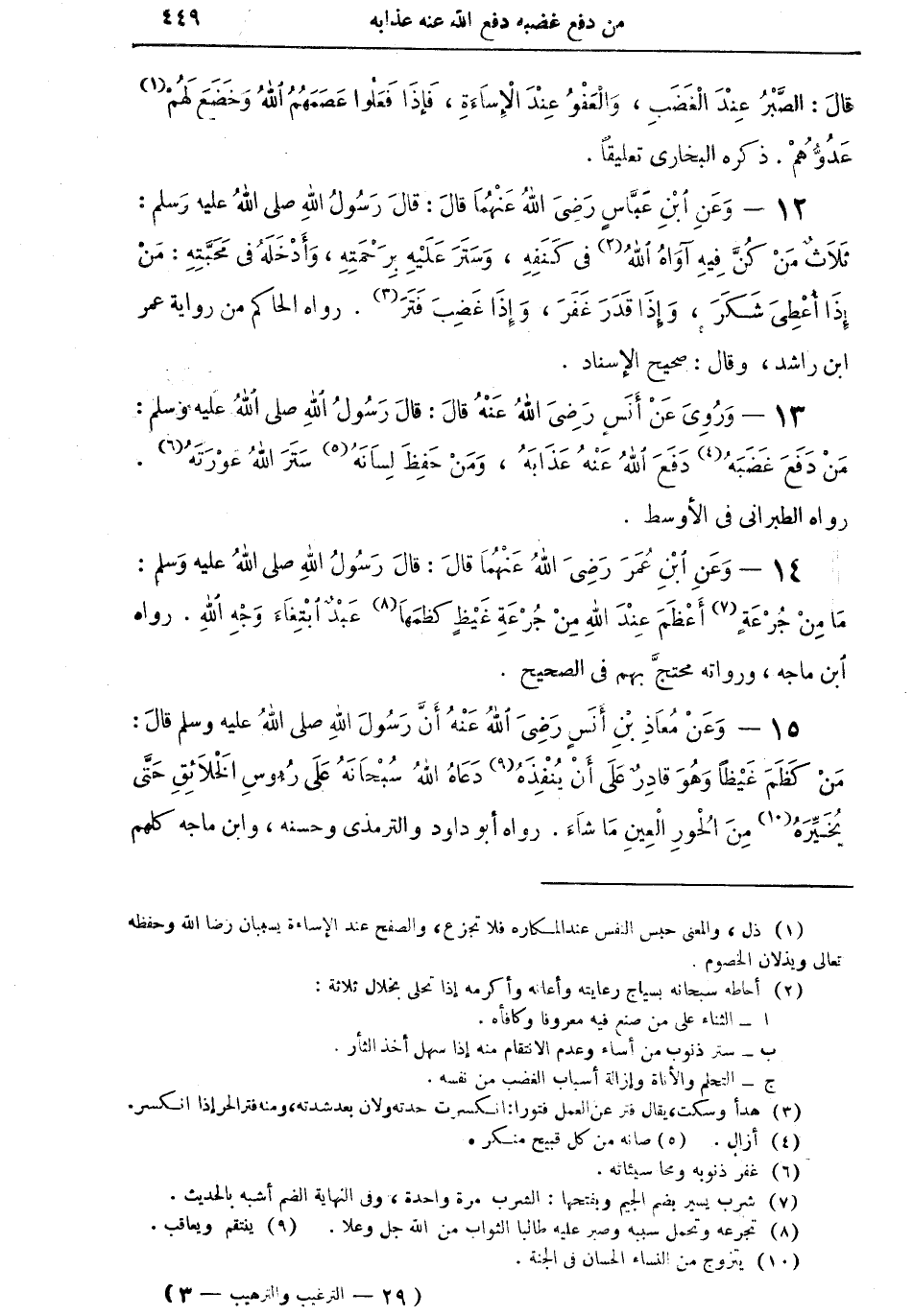 15 - وعن معاذ بن أنسٍ رضي الله عنه أن رسول الله صلى الله عليه وسلم قال: "من كظم غيظاً وهو قادرٌ على أن يُنْفِذَهُ (¬9) دعاهُ الله سبحانه على رءوس الخلائقِ حتى يُخَيِّرَهُ (¬10)