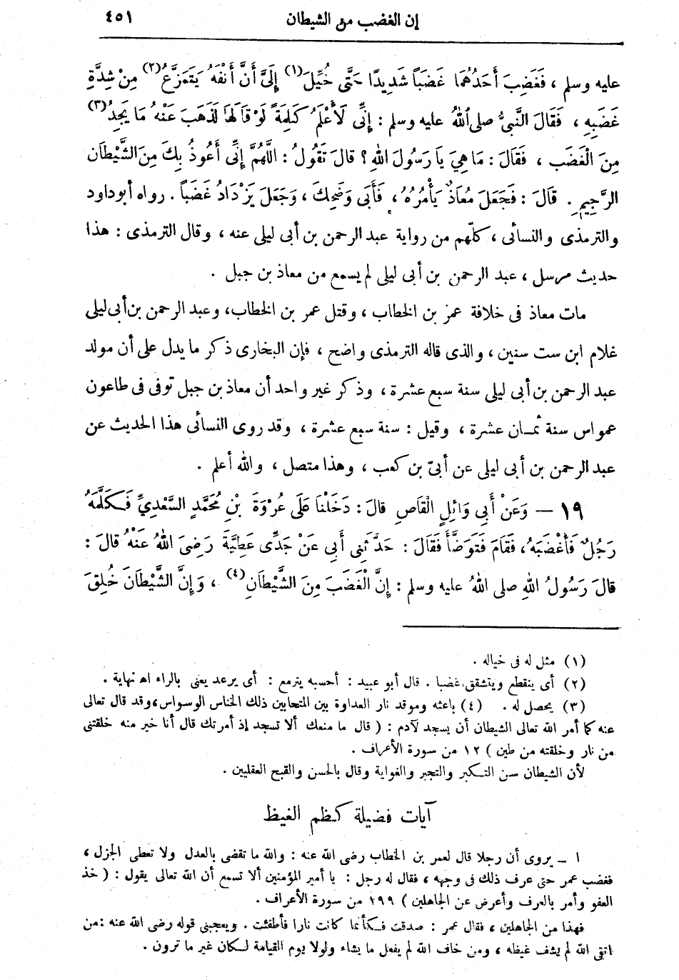 فغضب أحدهما غضباً شديداً حتى خُيِّلَ (¬1) إليَّ أن أنفهُ يتمرغُ (¬2) من شدة غضبهِ، فقال النبي صلى الله عليه وسلم: إني لأعلم كلمةً لو قالها لذهب عنه ما يجدُ (¬3) من الغضب، فقال: ما هي يا رسول الله؟ قال تقول: اللهم إني أعوذ بك من الشيطان الرجيم. قال: فجعل مُعاذٌ يأمرُهُ، فأبى وضحكَ، وجعل يزدادُ غضباً" رواه أبو داود والترمذي والنسائي، كلهم من رواية عبد الرحمن بن أبي ليلى عنه، وقال الترمذي: هذا حديث مرسل، عبد الرحمن بن أبي ليلى لم يسمع من معاذ بن جبل.