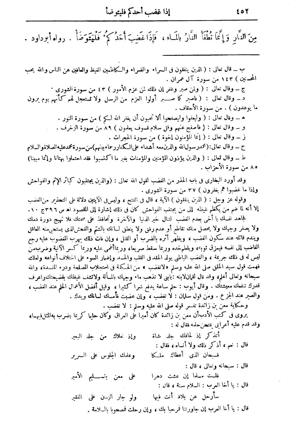 وقد أورد البخاري في باب الحذر من الغضب لقول الله تعالى: "والذين يجتنبون كبائر الإثم والفواحش وإذا ما غضبوا هم يغفرون" (37 من سورة الشورى). وقوله عز وجل: "الذين ينفقون" الآية، قال في الفتح، وليس في الآيتين دلالة على التحذير من الغضب إلا أنه لما ضم من يكظم غيظه إلى من يجتنب الفواحش كان في ذلك إشارة إلى المقصود. أهـ ص 396 جـ 10