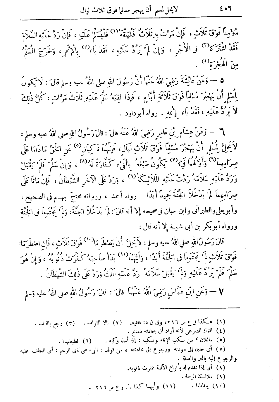 5 - وعن عائشة رضي الله عنها أن رسول الله صلى الله عليه وسلم قال: لا يكونُ لمسلمٍ أن يهجرَ مُسلماً فوق ثلاثةِ أيامٍ، فإذا لَقِيَهُ سَلَّمَ عليه ثلاثَ مراتٍ، كُلُّ ذلك لا يَرُدُّ عليه، فقد باء بإثمه" رواه أبو داود.