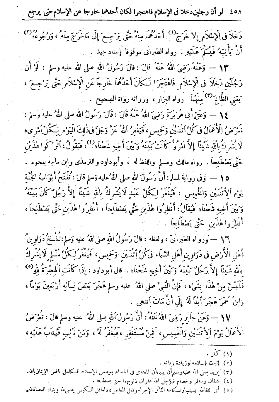 13 - وعنه رضي الله عنه قال: قال رسول الله صلى الله عليه وسلم: "لو أن رجلين دخلا في الإسلام فاهْتَجَرَا لكان أحدهما خارجاً عن الإسلام حتى يرجعَ، يعني الظالم (¬3) منهما" رواه البزار، ورواته رواة الصحيح.