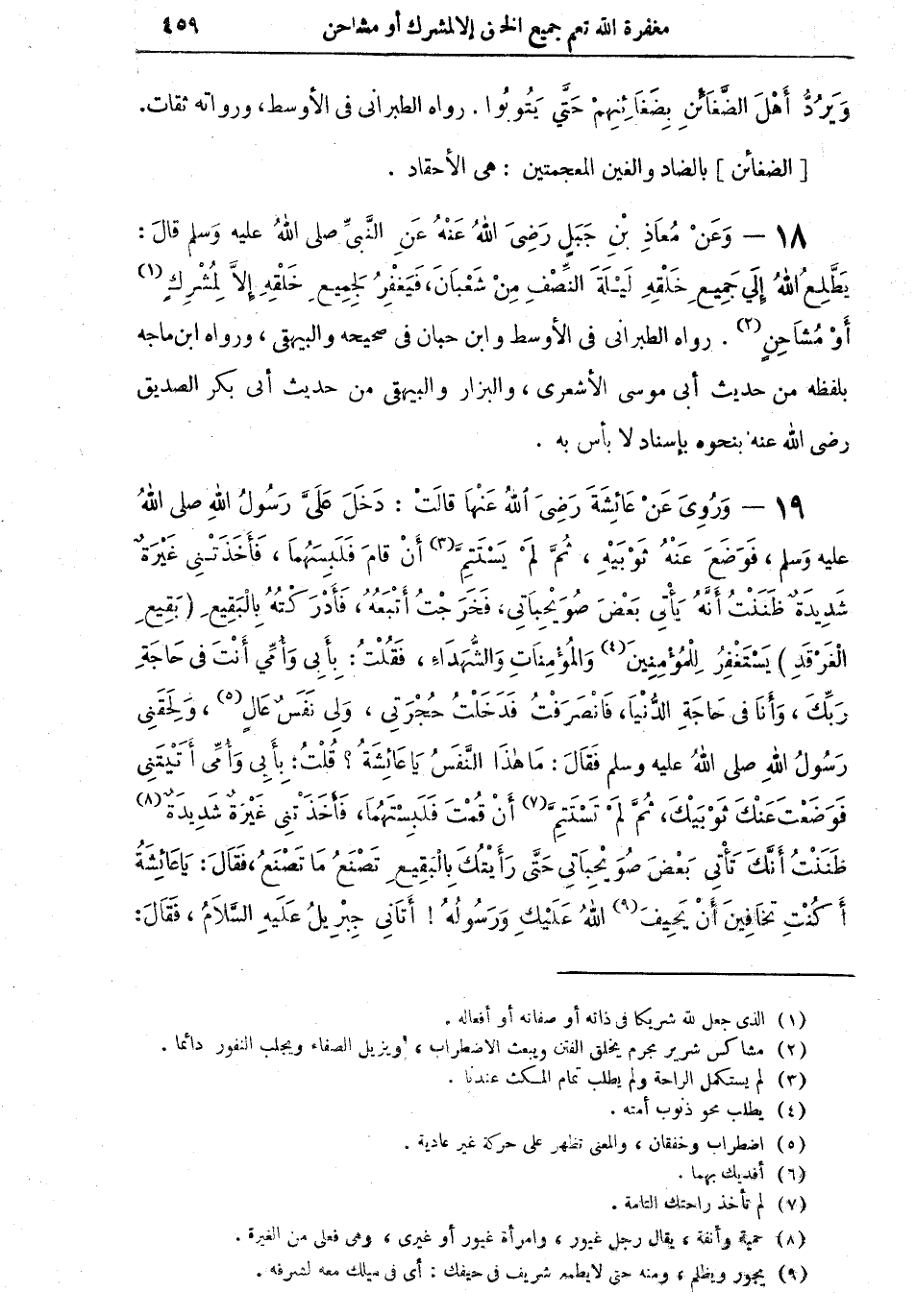 18 - وعن معاذ بن جبلٍ رضي الله عنه عن النبي صلى الله عليه وسلم قال: "يَطَّلِعُ اللهُ إلى جميع خَلْقِهِ ليلةَ النصف من شعبان، فَيَغْفِرُ لجميعِ خلقهِ إلا لِمُشركٍ (¬1) أو مُشاحنٍ (¬2) " رواه الطبراني في الأوسط وابن حبان في صحيحه والبيهقي، ورواه ابن ماجة بلفظه من حديث أبي موسى الأشعري، والبزار والبيهقي من حديث أبي بكر الصديق رضي الله عنه بنحوه بإسناد لا بأس به.