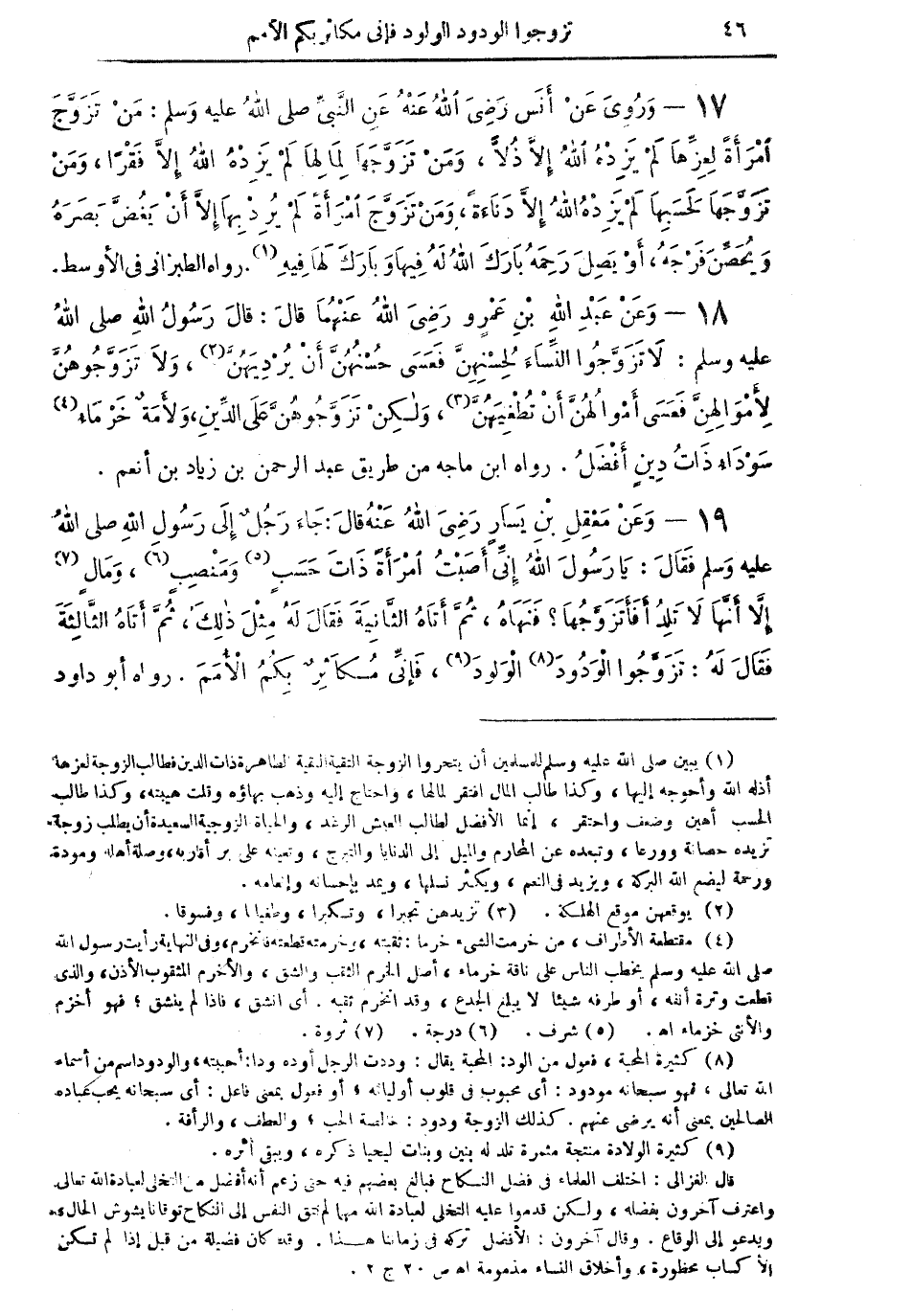 19 - وعن معقل بن يسار رضي الله عنه قال: "جاء رجل إلى رسول الله صلى الله عليه وسلم فقال يا رسول الله: إني أصبتُ امرأةً ذات حَسَبٍ (¬5) ومَنْصَبٍ (¬6) ومَالٍ (¬7) إلا أنها لا تلدُ أفأتزوجها؟ فنهاهُ، ثم أتاه الثانية فقال له: مثل ذلك، ثم أتاه الثالثة فقال له: تزوجود الودود (¬8) الولود (¬9)، فإني مكاثرٌ بكم الأمم" رواه أبو داود