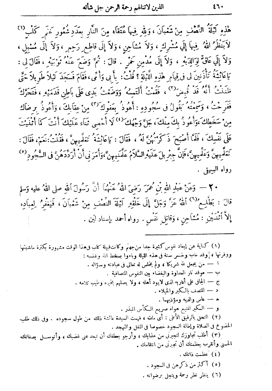 20 - وعن عبد الله بن عمر رضي الله عنهما أن رسول الله صلى الله عليه وسلم قال: "يَطَّلِعُ (¬6) الله عز وجل إلى خلقهِ ليلة النصف من شعبان، فيغفرُ لعباده إلا اثنين: مُشاحنٍ، وقاتلِ نفسٍ" رواه أحمد بإسناد لين.