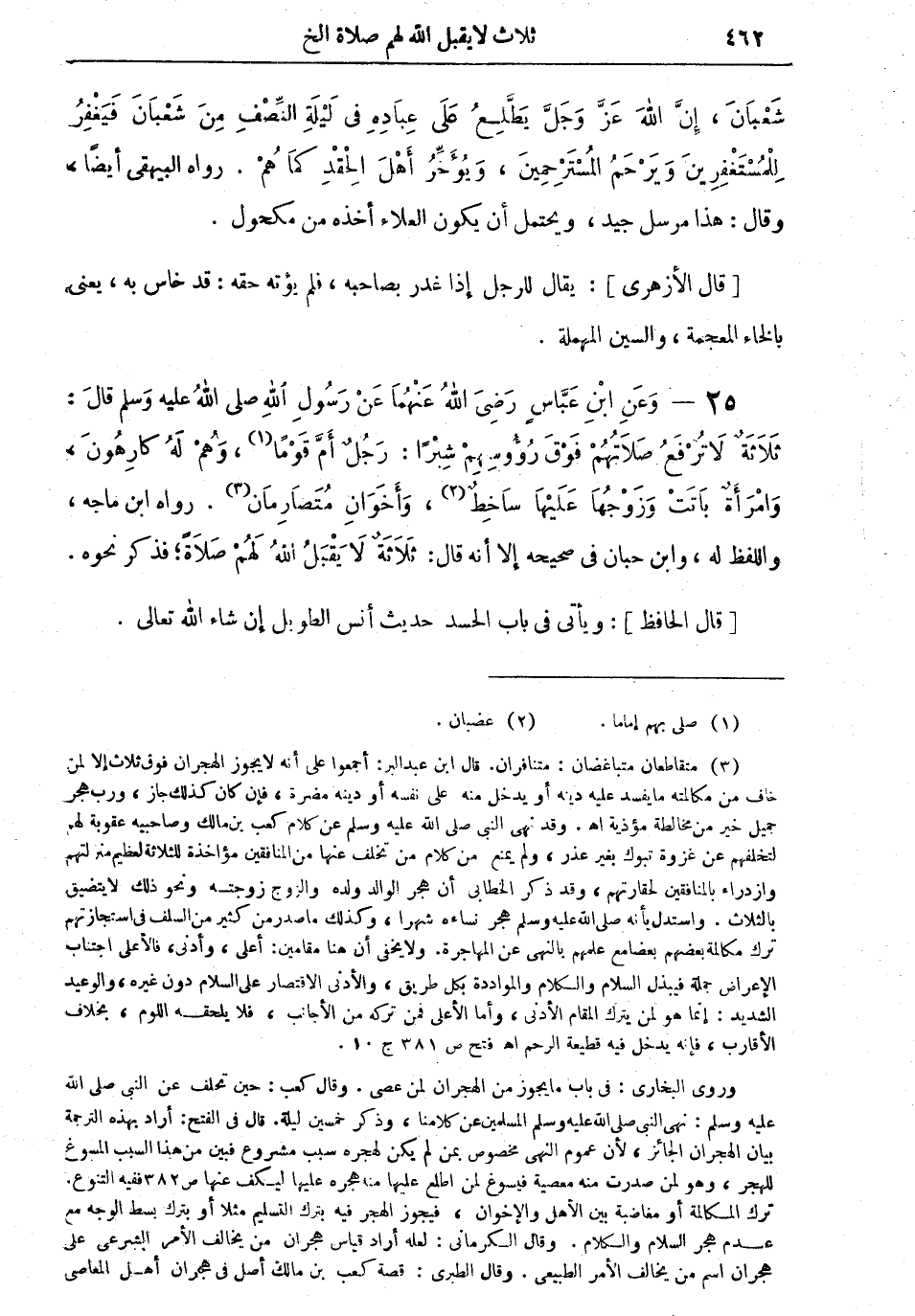25 - وعن ابن عباسٍ رضي الله عنهما عن رسول الله صلى الله عليه وسلم قال: "ثلاثةٌ لا تُرفعُ صلاتهم فوق رءوسهم شبراً: رجلٌ أمَّ قوماً (¬1)، وهم له كارهون، وامرأةٌ باتت وزوجها عليها ساخطٌ (¬2)، وأخوان مُتَصارمانِ (¬3) " رواه ابن ماجة، واللفظ له، وابن حبان في صحيحه إلا أنه قال: "ثلاثةٌ لا يقبلُ الله لهم صلاةً" فذكر نحوه.
