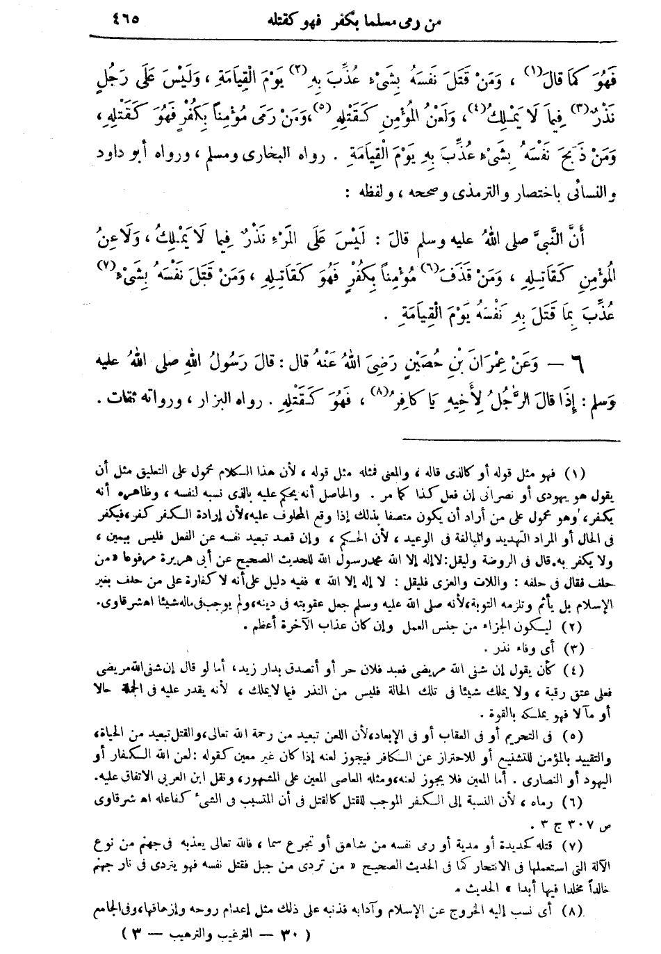 يوم القيامة، وليس على رجلٍ نذرٌ (¬3) فيما لا يملك (¬4)، وَلَعْنُ المؤمن كقتلهِ (¬5)، ومن رمى مؤمناً بكفر فهو كقتله، ومن ذبح نفسهُ بشيء عُذِّبَ به يوم القيامة" رواه البخاري ومسلم، ورواه أبو داود والنسائي باختصار والترمذي وصححه، ولفظه: "أن النبي صلى الله عليه وسلم قال: ليس على المرء نذرٌ فيما لا يملكُ، وَلاَعِنُ المؤمن كقاتلهِ، ومن قذف (¬6) مؤمناً بكفرٍ فهو كقاتله، ومن قتل نفسهُ بشيء (¬7) عُذِّبَ بما قتل به نفسهُ يوم القيامة".