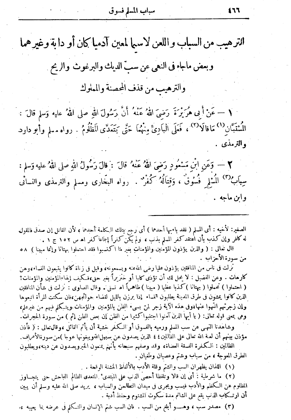 2 - وعن ابن مسعودٍ رضي الله عنه قال: قال رسول الله صلى الله عليه وسلم: "سباب (¬3) المسلم فُسوقٌ، وقتالهُ كفرٌ" رواه البخاري ومسلم والترمذي والنسائي وابن ماجة.