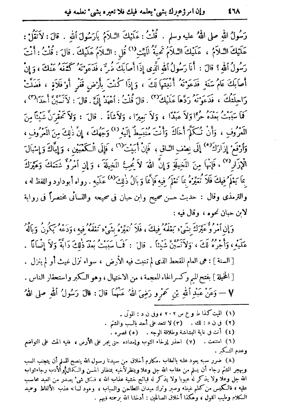 رسول الله صلى الله عليه وسلم. قلتُ: عليك السلامُ يا رسول الله. قال: لا تقل: عليك السلامُ، عليك السلامُ تحيةُ الميتِ (¬1) قل: السلامُ عليك. قال: قلتُ: أنت رسول الله؟ قال: أنا رسول الله الذي إذا أصابك ضُرٌّ، فدعوتهُ كَشَفَهُ عنك، وإن أصابك عامُ سَنَةٍ فدعوتهُ أنبتها لك، وإذا كنت بأرضٍ قَفْرٍ، أو فلاةٍ، فَضَلَّتْ راحلتك، فدعوته رَدَّهَا عليك (¬2). قال قلتُ: اعهد إليَّ. قال: لا تَسُبَّنَّ أحداً (¬3)، فما سببتُ بعدهُ حُراً ولا عبداً، ولا بعيراً، ولا شاةً. قال: ولا تَحْقِرَنَّ شيئاً من المعروف، وأن تُكَلِّمَ أخاك، وأنت مُنْبَسِطٌ إليه (¬4) وجهك، إن ذلك من المعروف، وارفع إزارك (¬5) إلى نصف الساق، فإن أبيت (¬6)، فإلى الكعبين، وإياك وإسبالَ الإزارِ (¬7)، فإنها من المخيلةِ وإن الله لا يُحبُّ المخيلةَ، وإن امرؤ شتمك وعَيَّرَكَ بما يعلمُ فيك فلا تُعَيِّرْهُ بما تعلمُ فيه فإنما وَبَالُ ذلك (¬8)