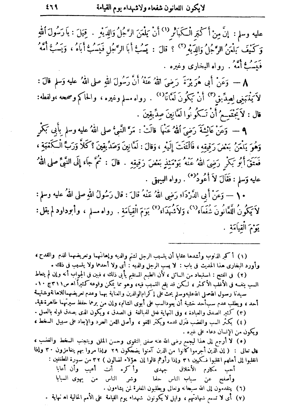 10 - وعن أبي الدرداء رضي الله عنه قال: قال رسول الله صلى الله عليه وسلم: "لا يكونُ اللعانون شُفعاء (¬6)، ولا شُهداء (¬7) يوم القيامة" رواه مسلم، وأبو داود لم يقل: يوم القيامة.
