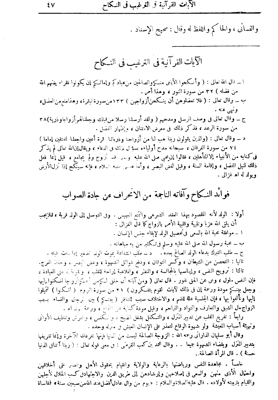 (د) وقال اتعالى: "والذين يقولون ربنا هب لنا من أزواجنا وذرياتنا قرة أعين واجعلنا للمتقين إماما" (74 من سورة الفرقان)، سبحانه مدح أولياءه بسؤال ذلك في الدعاء، ويقال إن الله تعالى لم يذكر في كتابه من الأنبياء إلا المتأهلين، فقالوا إن يحيى صلى الله عليه وسلم قد تزوج ولم يجامع، قيل إنما فعل ذلك لنيل الفضل، وإقامة السنة، وقيل لغض البصر، وأما عيسى عليه السلام، فإنه سينكح إذا نزل الأرض ويولد له. أ. هـ. (غزالي).