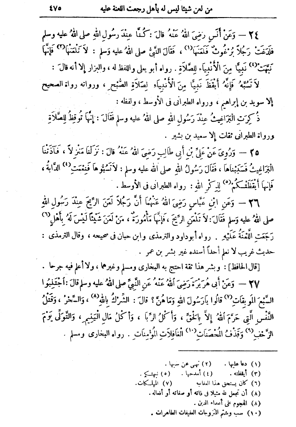 26 - وعن ابن عباس رضي الله عنهما: "أن رجلاً لعن الريح عند رسول الله صلى الله عليه وسلم فقال: لا تلعنِ الريحَ، فإنها مأمورةٌ، من لعن شيئاً ليس له بأهلٍ (¬6) رجعتِ اللعنةُ عليه" رواه أبو داود والترمذي وابن حبان في صحيحه، وقال الترمذي: حديث غريب لا نعلم أحداً أسنده غير بشر بن عمر.