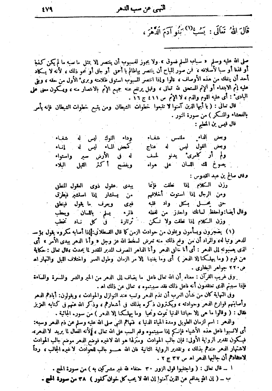 والدهر: اسم للزمان الطويل ومدة الحياة الدنيا، فنهاهم النبي صلى الله عليه وسلم عن ذم الدهر وسبه: أي لا تسبوا فاعل هذه الأشياء فإنكم إذا سببتموه وقع السب على الله تعالى، لأنه الفعال لما يريد، لا الدهر فيكون تقدير الرواية الأولى، فإن جالب الحوادث ومنزلها هو الله لا غيره فوضع الدهر موضع جالب الحوادث لاشتهار الدهر عندهم بذلك، وتقدير الرواية الثانية فإن الله هو جالب للحوادث لا غيره الجالب، رداً لاعتقادهم أن جالبها الدهر. أهـ ص 37 جـ 2