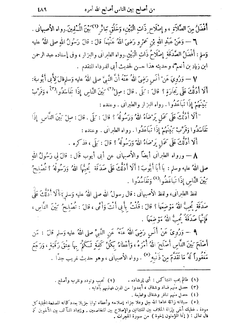 6 - وعن عبد الله بن عمروٍ رضي الله عنهما قال: قال رسول الله صلى الله عليه وسلم: "أفضلُ الصدقة إصلاحُ ذاتِ البين" رواه الطبراني والبزار، وفي إسناده عبد الرحمن بن زياد بن أنعم، وحديثه هذا حسن، لحديث أبي الدرداء المتقدم.