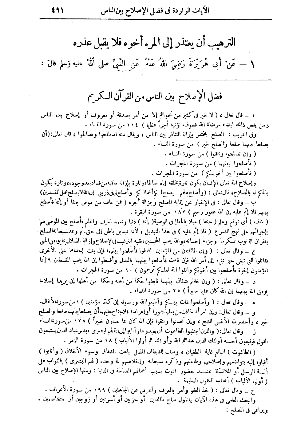 (هـ) وقال تعالى: "وأصلحوا ذات بينكم وأطيعوا الله ورسوله إن كنتم مؤمنين" (1 من سورة الأنفال).