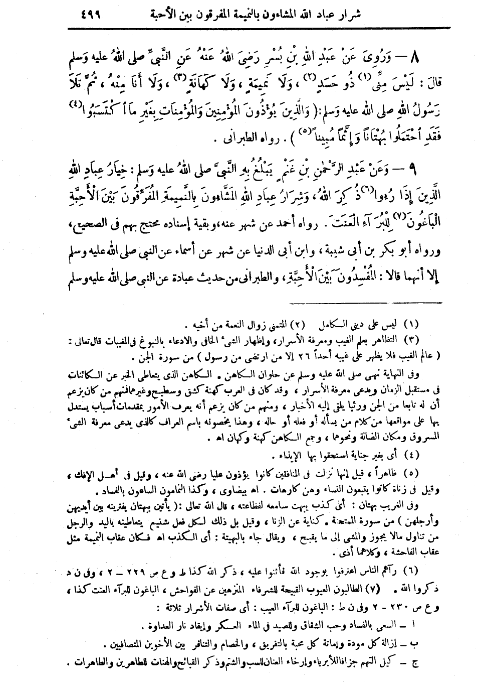 8 - ورويَ عن عبد الله بن بُسْرٍ رضي الله عنه عن النبي صلى الله عليه وسلم قال: "ليس مني (¬1) ذو حسدٍ (¬2)، ولا نميمةٍ، ولا كَهَانَةٍ (¬3)، ولا أنا منه، ثم تلا رسول الله صلى الله عليه وسلم: (وَالَّذِينَ يُؤْذُونَ المؤْمِنِينَ وَالْمُؤْمِنَاتِ بِغَيْر مَا اكْتَسَبُوا (¬4) فَقَدِ احْتَمَلُوا بُهْتَاناً وإثْماً مُبِيناً) (¬5) " رواه الطبراني.