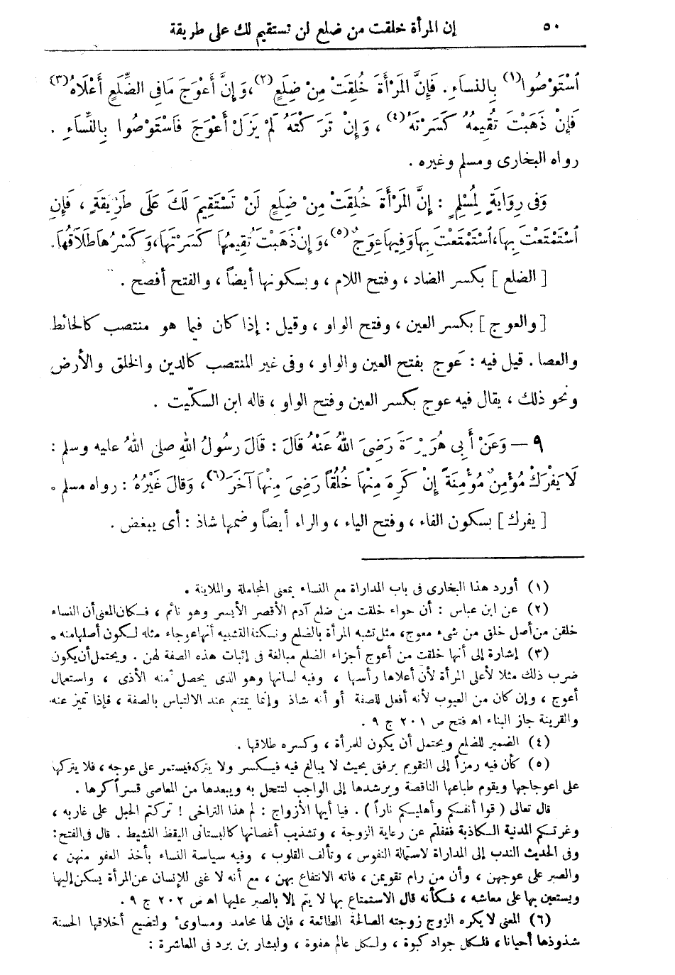 (¬5) كأن فيه رمزاً إلى التقويم برفق بحيث لا يبالغ فيه فيكسر، ولا يتركه فيستمر على عوجه، فلا يتركها على اعوجاجها، ويقوم طباعها الناقصة، ويرشدها إلى الواجب لتتحلى به، ويبعدها من المعاصي قسراً كرهاً، قال تعالى: "قوا أنفسكم وأهليكم ناراً" فيا أيها الأزواج: لم هذا التراخي! تركتم الحبل على غاربه، وغرتكم المدنية الكاذبة فغفلتم عن رعاية الزوجة، وتشذيب أغصانها كالبستاني اليقظ النشيط، قال في الفتح: وفي الحديث الندب إلى المداراة لاستمالة النفوس، وتألف القلوب، وفيه سياسة النساء بأخذ العفو منهن، والصبر على عوجهن، وأن من رام تقويمهن، فإنه الانتفاع بهن، مع أنه لا غنى للإنسان عن المرأة يسكن إليها ويستعين بها على معاشه، فكأنه قال الاستمتاع بها لا يتم إلا بالصبر عليها. أ. هـ (ص 202 جـ 9).