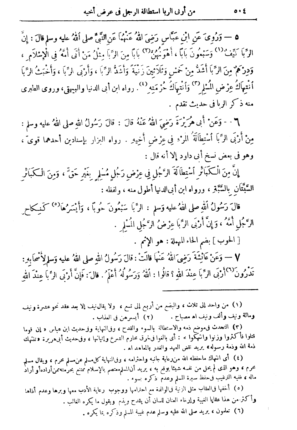 6 - وعن أبي هريرة رضي الله عنه قال: قال رسول الله صلى الله عليه وسلم: "من أرْبَى الربا استطالةُ المرء في عَرْضِ أخيه" رواه البزار بإسنادين أحدهما قوي، وهو في بعض نسخ أبي داود إلا أنه قال: "إن من الكبائر استطالة الرجل في عِرْضِ رجلٍ مسلمٍ بغير حقٍ، ومن الكبائر السَّبَّتَأنِ بالسَّبَّةِ" ورواه ابن أبي الدنيا أطول منه، ولفظه: "قال رسول الله صلى الله عليه وسلم: الربا سبعون حُوباً، وأيسرها (¬5) كنكاح الرجل أمهُ، وإن أربى الربا عِرْضُ الرجل المسلم".