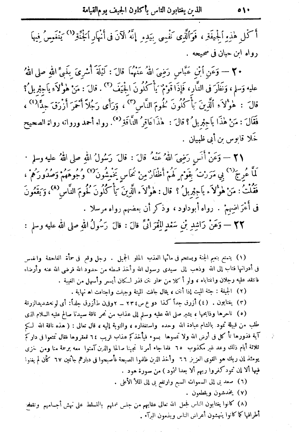 20 - وعن ابن عباس رضي الله عنهما قال: "ليلة أُسريَ بنبي الله صلى الله عليه وسلم، ونظر في النار، فإذا قومٌ يأكلون الجيفَ (¬2). قال: من هؤلاء يا جبريلُ؟ قال: هؤلاء الذين يأكلون لحومَ الناس (¬3)، ورأى رجُلاً أحمرَ أزرقَ جِداً (¬4)، فقال: من هذا يا جبريلُ؟ قال: هذا عاقرُ الناقة (¬5) " رواه أحمد ورواته رواة الصحيح خلا قابوس ابن أبي ظبيان.
