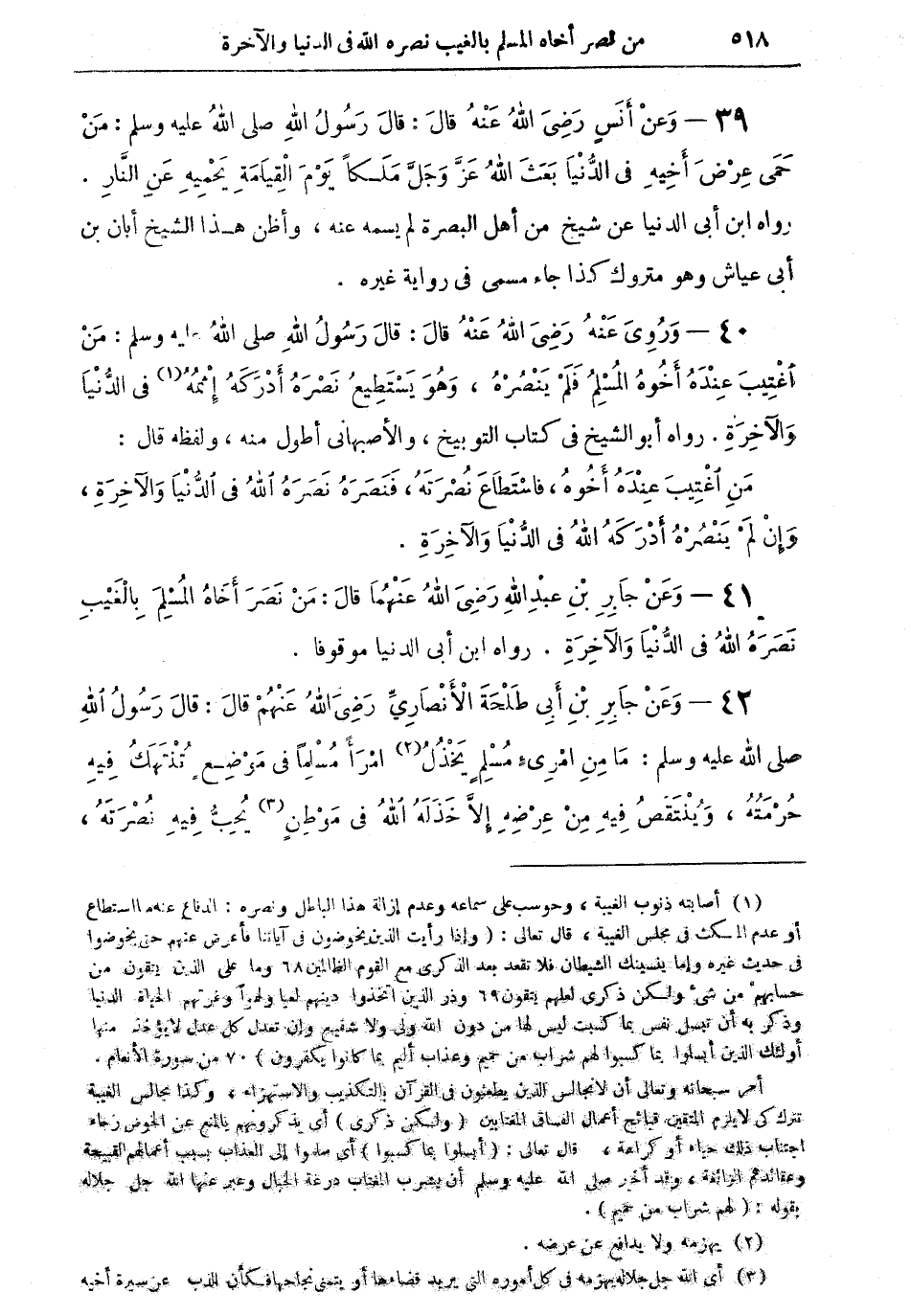 41 - وعن جابر بن عبد الله رضي الله عنهما قال: "من نصر أخاه المسلم بالغيبِ نصرهُ الله في الدنيا والآخرة" رواه ابن أبي الدنيا موقوفاً.