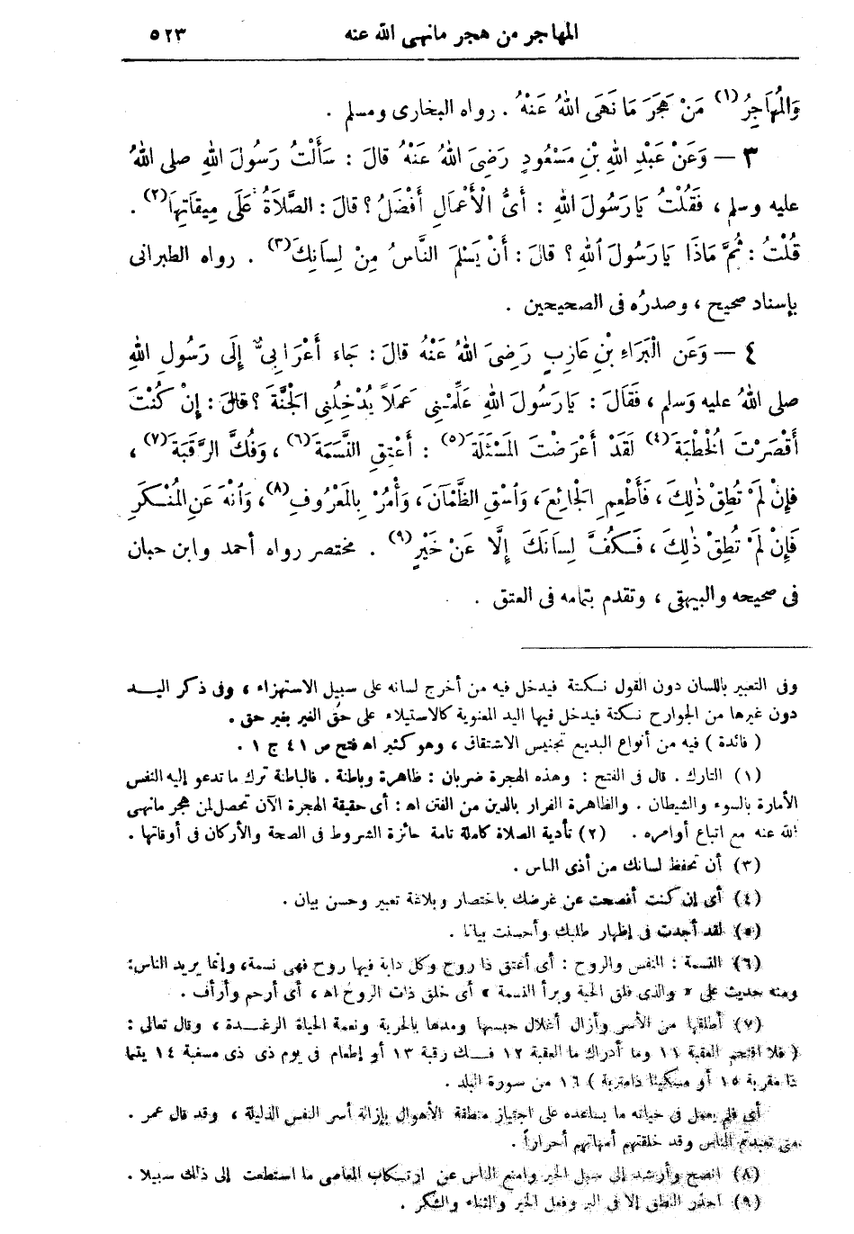 3 - وعن عبد الله بن مسعود رضي الله عنه قال: "سألت رسول الله صلى الله عليه وسلم، فقلتُ يا رسول اله: أي الأعمال أفضلُ؟ قال: الصلاة على ميقاتها (¬2). قلتُ ثم ماذا يا رسول الله؟ قال: أن يَسْلَمَ الناسُ من لسانك (¬3) " رواه الطبراني بإسناد صحيح، وصدرُه في الصحيحين.