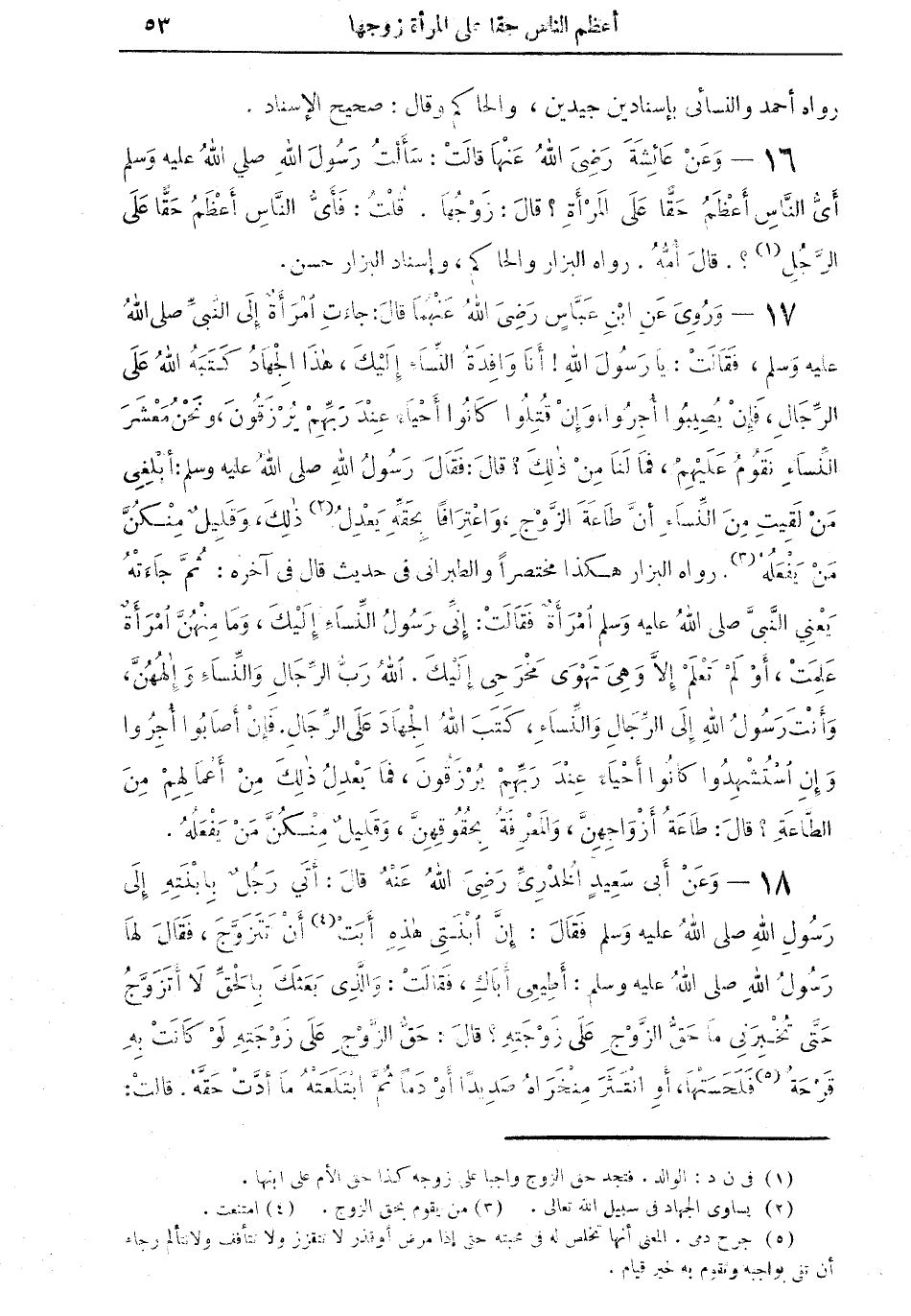 16 - وعن عائشة رضي الله عنها قالت: سألت رسول الله صلى الله عليه وسلم: "أي الناس أعظمُ حقاً على المرأة؟ قال: زوجها. قلت: فأيُّ الناس أعظم حقاً على الرجل (¬1)؟ قال أمُّهُ" رواه البزار والحاكم، وإسناد البزار حسن.
