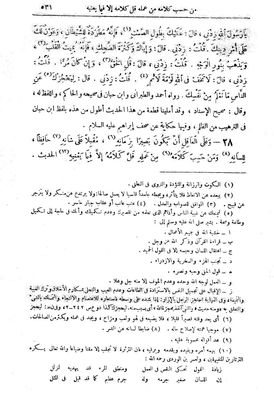 (¬10) يهمه أمره ويفيد ويقدمه ويرقيه، فإن الثرثرة لا تجلب إلا مقتاً وضياعاً والله تعالى يكره الثرثارون المتفيهقون، ولعمر بن الوردي رحمه الله: