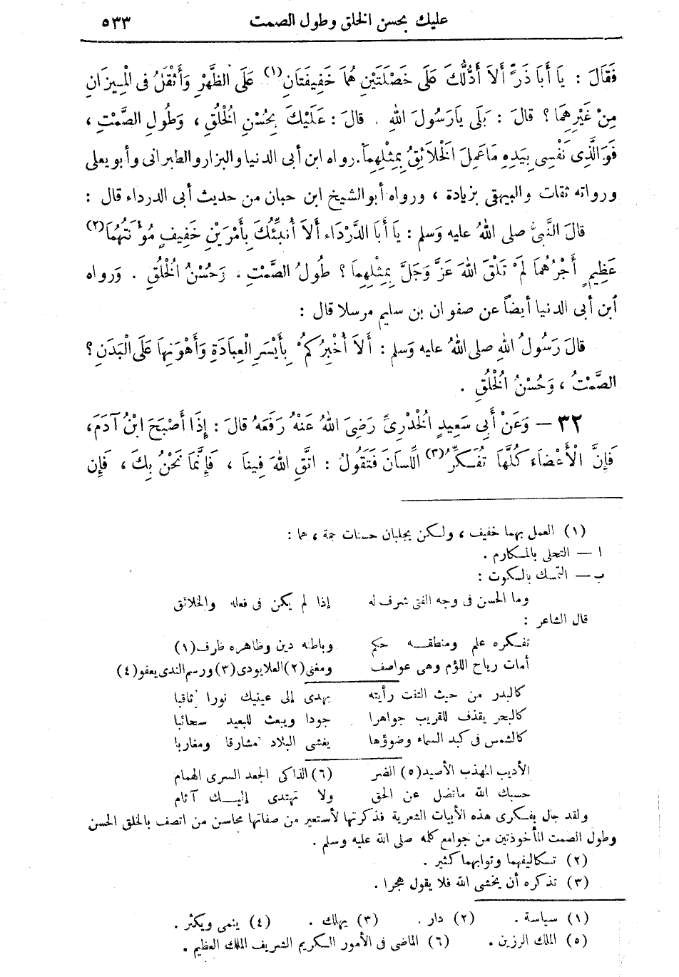 ولقد جال بفكري هذه الأبيات الشعرية فذكرتها لأستعير من صفاتها محاسن من اتصف بالخلق الحسن وطول الصمت المأخوذتين من جوامع كلمه صلى الله عليه وسلم.
